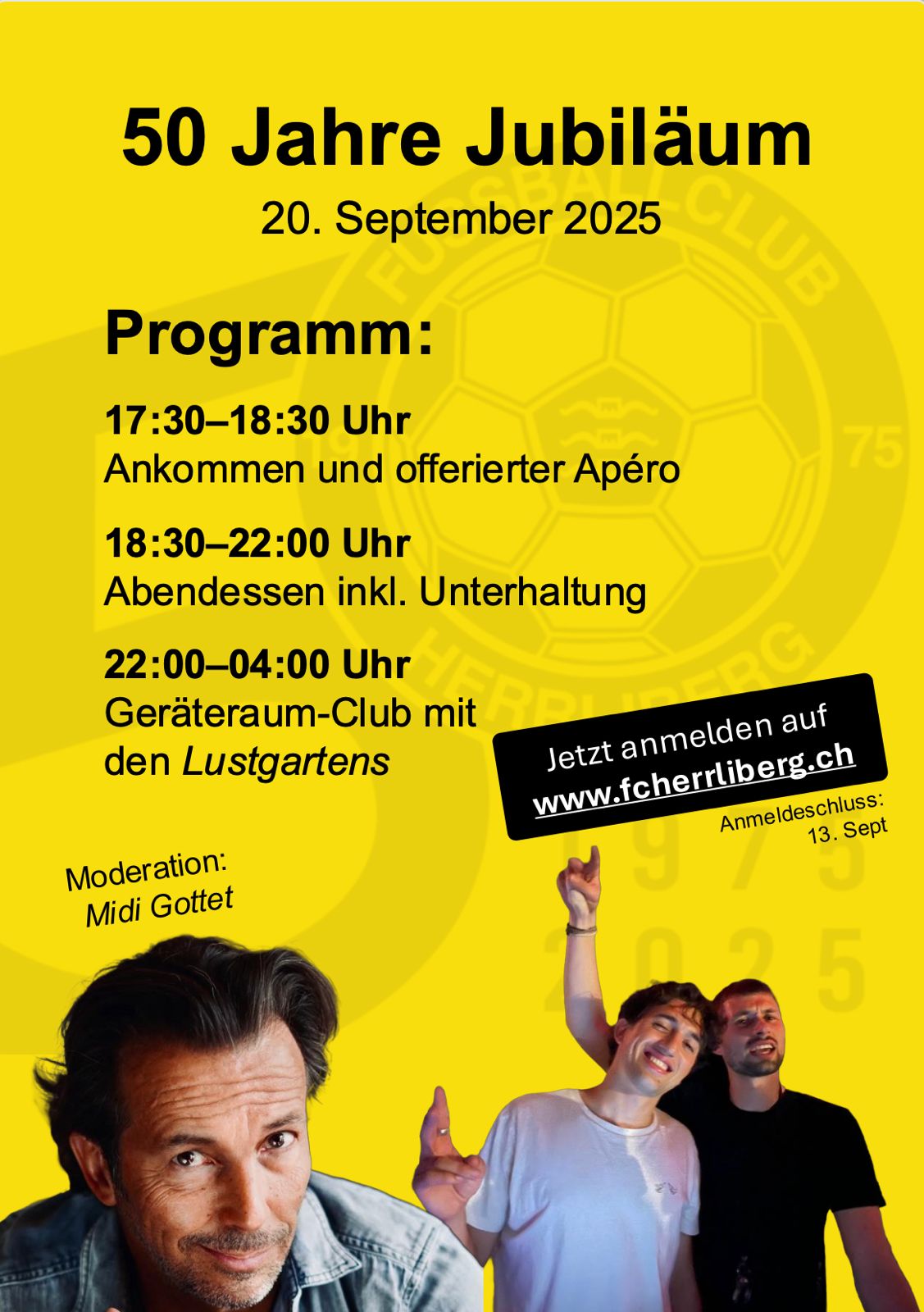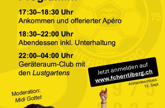 Der FC Herrliberg feiert dieses Jahr sein 50-jähriges Bestehen – und das wollen wir gebührend mit euch feiern! Wir laden alle herzlich ein, am Samstag, 20. September 2025, auf der Sportanlage Langacker mit uns einen unvergesslichen Tag zu erleben.